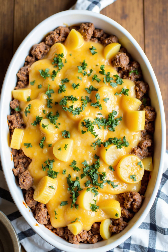 Everything comes together in just one baking dish: a layer of potatoes, followed by savory beef and onion, your choice of condensed soup for creaminess, and a generous blanket of cheese. The oven does the magic, melding all the ingredients into a comforting, filling casserole that’s easy to slice and serve.
